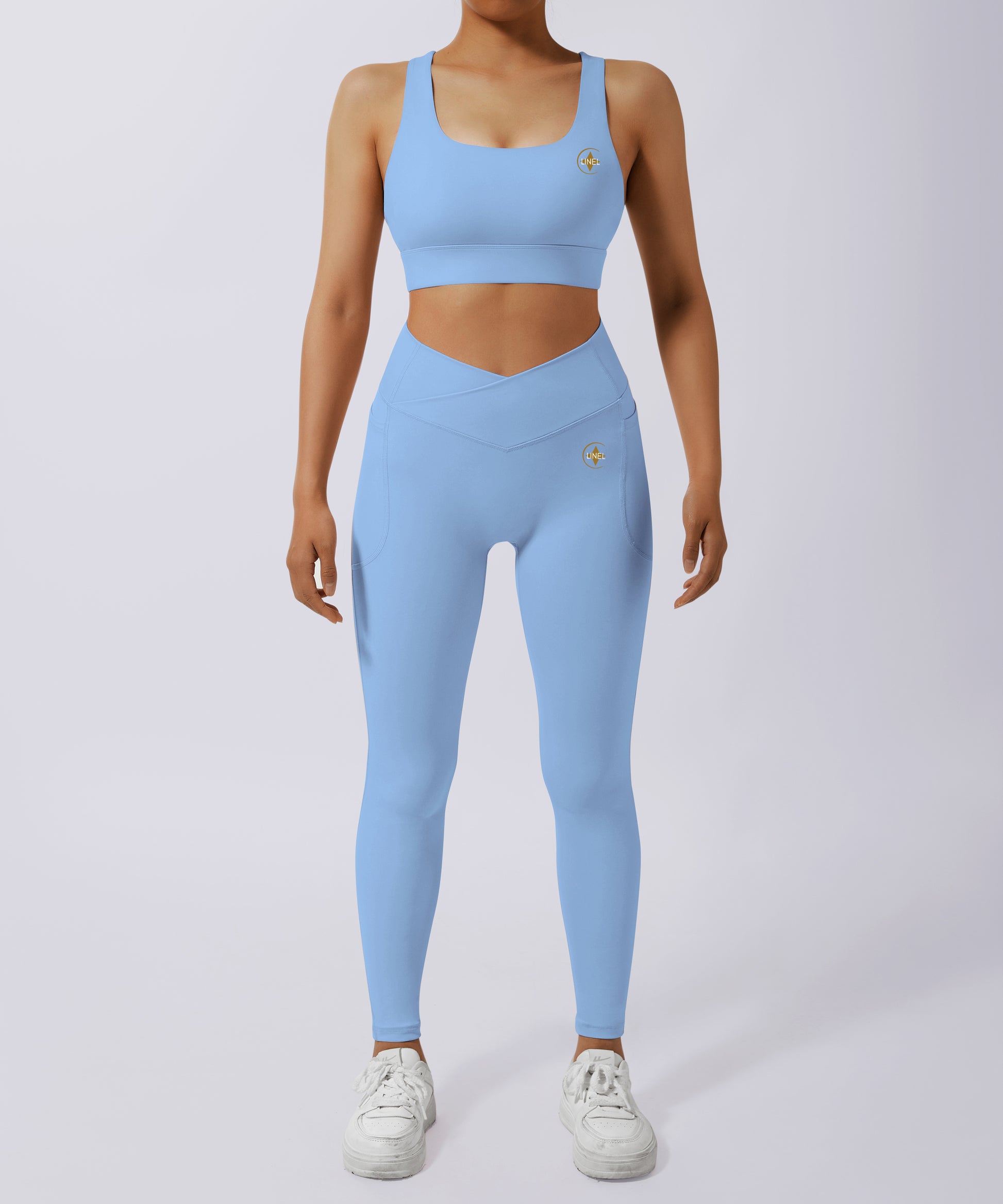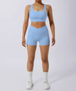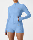 Enhance your workout with our Baby Blue Activewear Set. Includes sports bra, jacket, leggings, and shorts in baby blue. Moisture-wicking fabric for comfort and style.