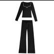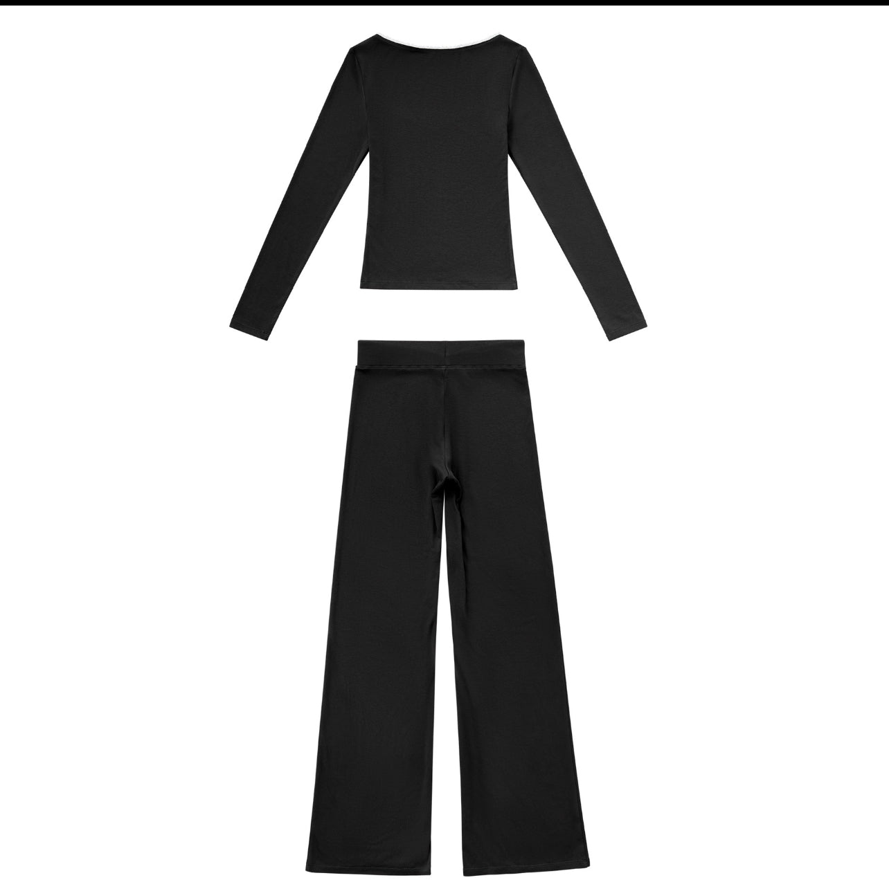 Indulge in the understated luxury of our Bella Black Two Piece Flare Pant Set. This meticulously crafted ensemble features sleek leggings that gracefully transition into an elegant flare silhouette, creating a lengthening effect that flatters every figure. The coordinating top completes this refined pairing, offering versatile sophistication for both daytime engagements and evening affairs. A testament to timeless style with contemporary sensibility.