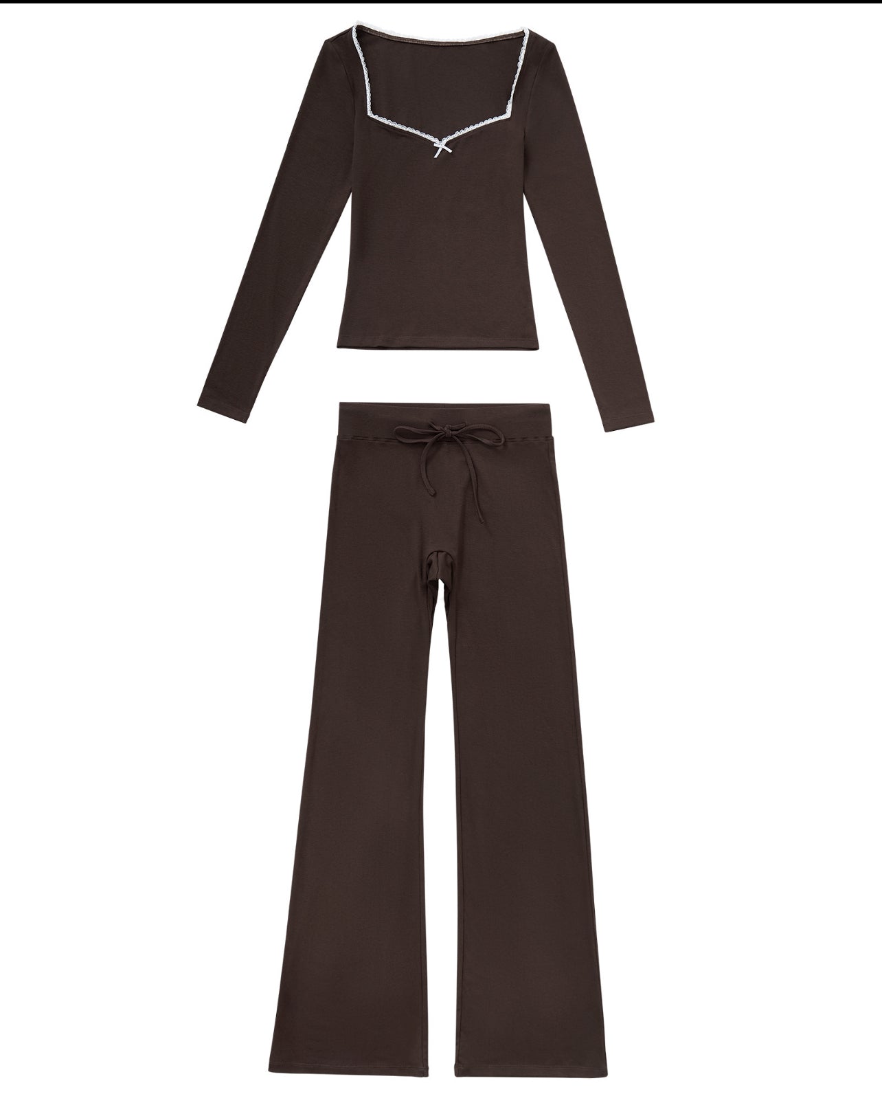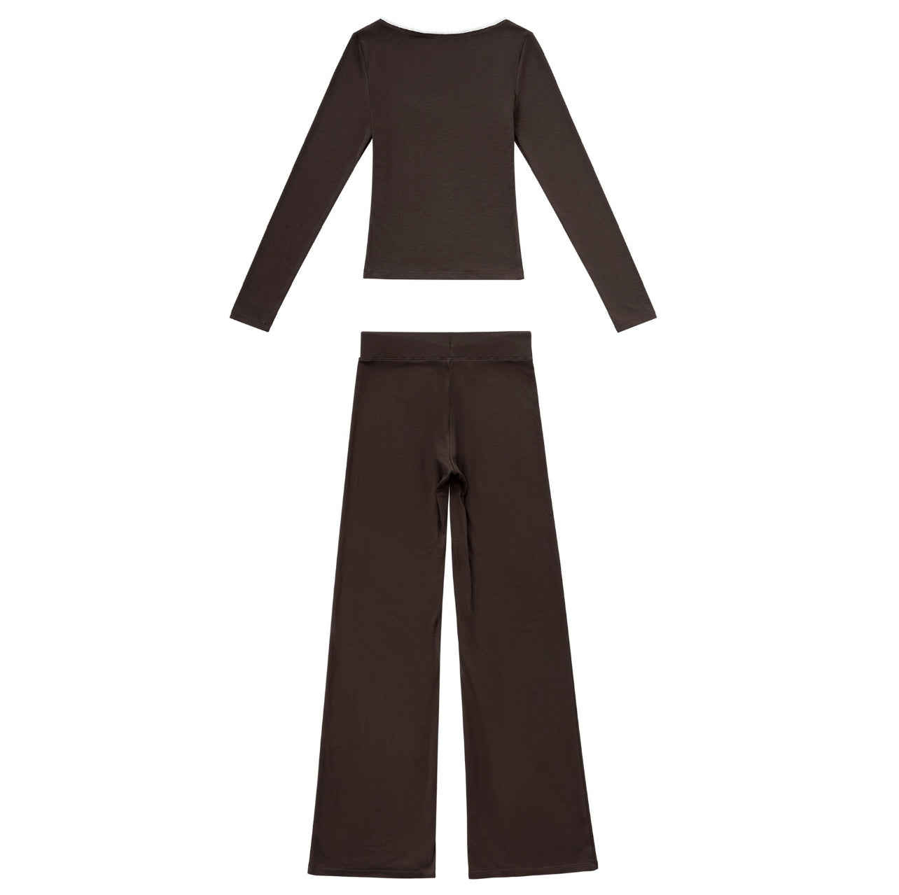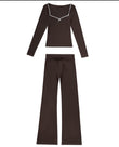 Indulge in refined style with our Coffee Two Piece Flare Pant Set. This exquisite ensemble features sleek leggings that gracefully flare at the hem, creating an elongated silhouette. The coordinating top completes the look with understated elegance, while the rich coffee hue offers versatile sophistication. Crafted for the discerning woman who appreciates both comfort and polished aesthetics, this set transitions effortlessly from day to evening affairs.